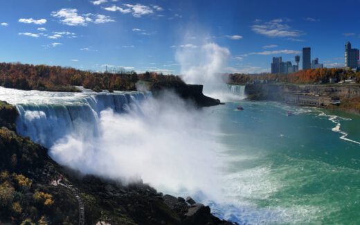 Wir sind solche Glückskinder! Nach einem grauen und tristen Tag heute nun das: Die Niagarafälle rauschen und tosen, die Sonne strahlt vor einem tiefblauen Himmel und der Herbst gibt alles.